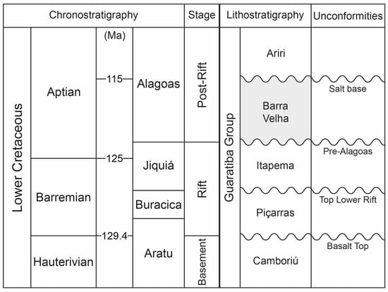 Lower Cretaceous stratigraphic chart for the Santos Basin (modified from Wright and Barnett [21] and Moreira et al. [27]).