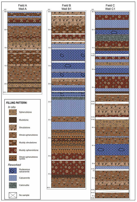 The BVF in situ deposits are composed of calcite spherulites and shrubs and the Mg-clay matrix, corresponding predominantly to muddy spherulstones and muddy shrubstones, followed by rare shrubstones, shrub-spherulstones, and mudstones (sensu De Ros and Oliveira [34]). Spherulstones are extremely rare, only represented by two samples. Muddy shrubstones and shrubstones tend to be more common toward the top of the wells, though they also occur as millimetric to centimetric intercalations with muddy spherulstones and as centimetric layers between reworked intervals.
