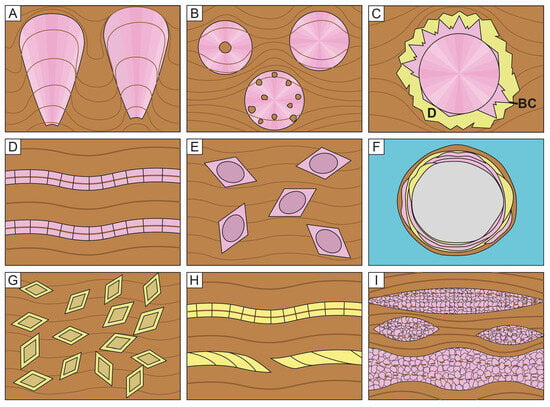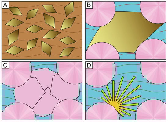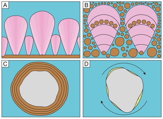 Clay peloids and siliciclastic grains are usually found engulfed by spherulitic and fascicular aggregates (Figure 7A and Figure 12B). This feature is found in concretions formed through the replacement and displacement of host sediment, indicative of formations under very shallow burial [90,91,92,93]. Calcite later replaced part of the engulfed peloids, generating an inclusion-rich, “turbid” texture. Rounded moldic pores within the shrubs and spherulites were formed by the dissolution of clay peloids. In shrubs which display peloids concentrated in growth zones, this dissolution porosity generated “dissolution bands” (Figure 10).