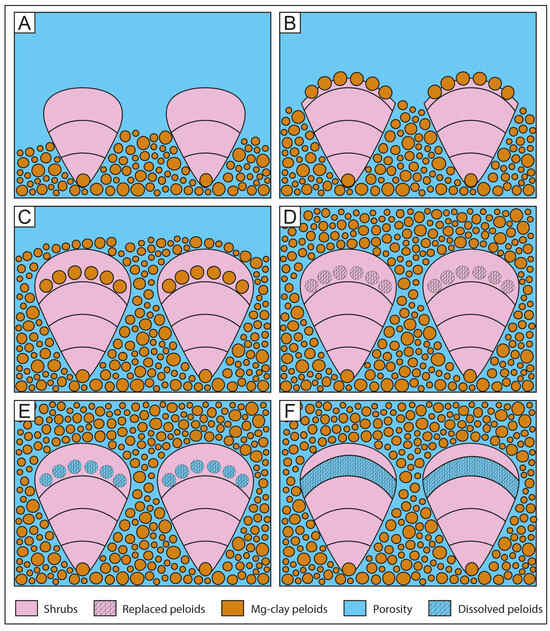 Schematic representation of dissolution of shrubs following their growth lines. (A) Initial stage of shrub formation with clay peloids as substrate. (B) Peloids deposited over shrubs and incipiently engulfed by the shrubs. (C) Shrub growth continues, engulfing the peloids. (D) Engulfed peloids replaced by calcite, leaving “ghosts” of their shapes. (E) Engulfed peloids dissolved. (F) Dissolution follows previously formed pores to create dissolution zones in the shrubs.