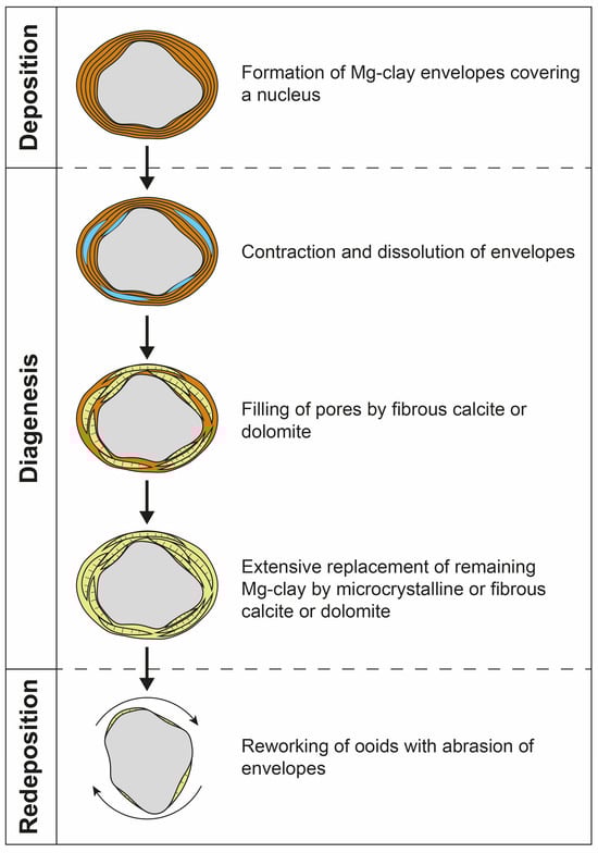 Schematic diagram for ooid formation, shrinkage of the clay envelopes and cementation by carbonates, complete replacement by carbonates, and later reworking and abrasion, as per Carramal et al. [24] (modified from Carramal et al. [24]).