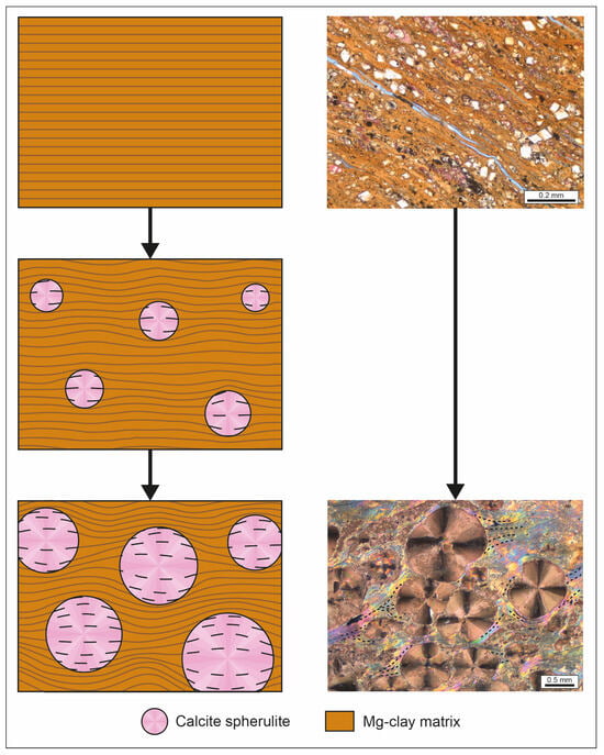 The eodiagenetic interactions include those developed between Mg-silicates and carbonates precipitated at very shallow burial depths beneath the sediment-water interface and still under the influence of the lacustrine waters. The spherulites and part of the fascicular shrubs replaced and deformed the Mg-clay matrix shortly after its deposition and before lithification. This is indicated by the deformation of the matrix laminations, and by remnants of the matrix included within the aggregates [8,10,16,24]. Other eodiagenetic relations include blocky calcite replacing the matrix as scattered crystals and as rims covering the calcite aggregates, matrix-replacive blocky dolomite and rims, lamellar carbonates filling shrinkage pores and replacing matrix, and matrix-replacive microcrystalline calcite (Figure 12).