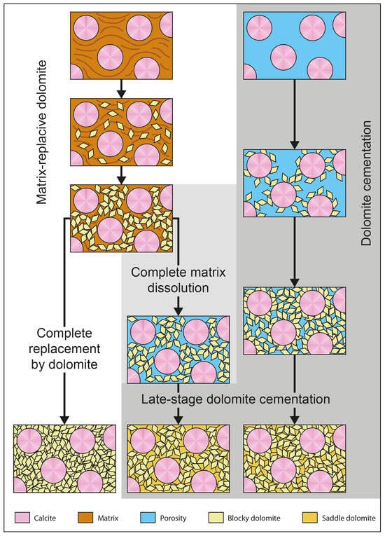 Schematic representation of the differential distribution generated by dolomite replacement of matrix and cementation of matrix-dissolution porosity.