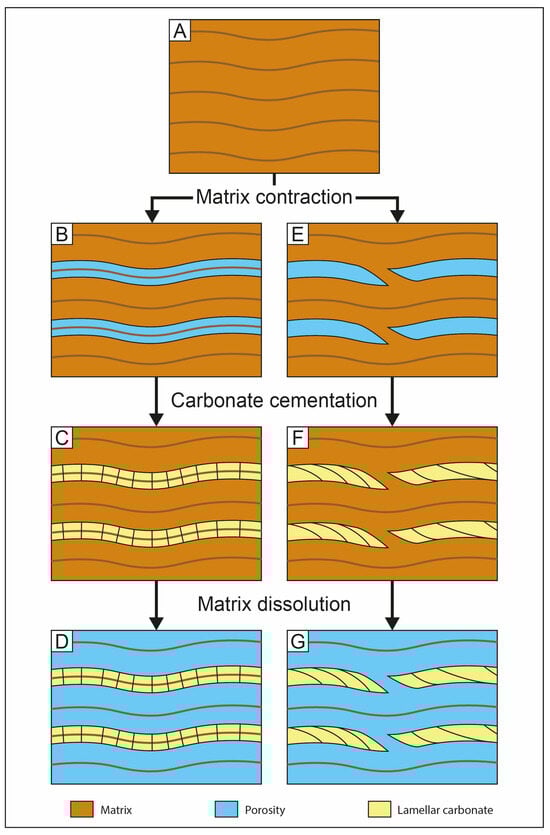 Schematic representation of two possible pathways for lamellar carbonate formation (modified from Carramal et al. [24]. The initial stage of laminated mud deposition (A) may follow two paths for lamellar carbonate precipitation. The left pathway shows extremely contracted matrix remnants (B) serving as a nucleus for perpendicular carbonate formation (C), which may be followed by complete matrix dissolution (D). The right pathway shows matrix contraction (E) followed by lamellar dolomite filling the shrinkage pores (F). Complete matrix dissolution creates floating lamellar carbonates (G), as also seen in the left pathway (D).