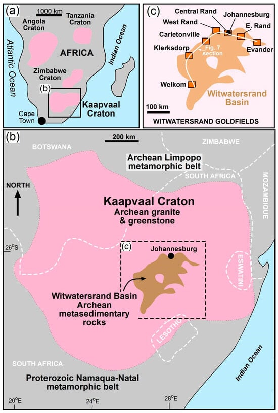 Figure 1. (a) Map of southern Africa highlighting the Archean Kaapvaal Craton (b), the Witwatersrand Basin, Johannesburg, and the seven major goldfields. In (c), the white line connecting the goldfields shows the extent of the Witwatersrand gold reefs.