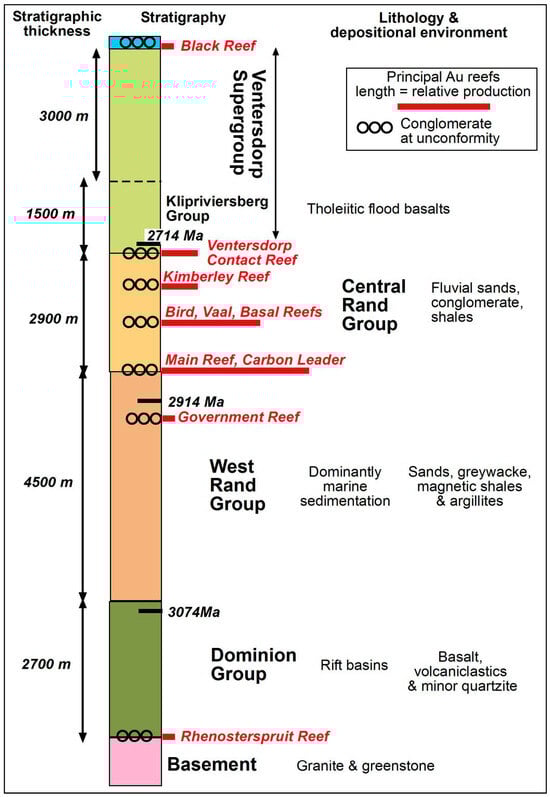 27. Winter, H.D.L.R.; Brink, M.C. Chronostratigraphic subdivision of the Witwatersrand Basin based on Western Transvaal composite columns. S. Afr. J. Geol. 1991, 94, 191–203. [Google Scholar]