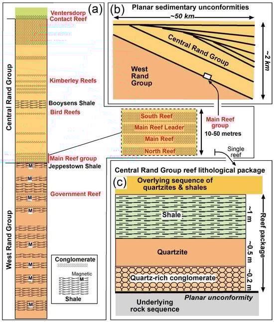 The Witwatersrand Supergroup is best known for outcrops and mine exposures for 300 km from Evander to the East Rand, Johannesburg, Carletonville, Klerksdorp, and Welkom. The lower part of the Supergroup is widespread and probably covers a large proportion of the Kaapvaal Craton [9]. The overall rock types vary from a shale–sandstone dominated lower part to a sandstone–conglomerate dominated upper part, with numerous unconformity surfaces mapped in mines and drill core. These assist basin-wide correlation [27] and include an unconformity separating the lower and upper Witwatersrand successions (Figure 5).