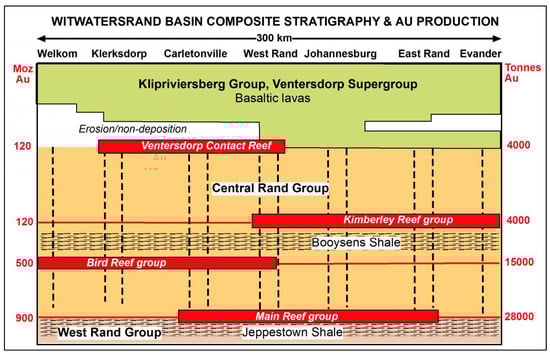 Syntheses by [16] are compiled and written with a global perspective; the author was able to utilise his extensive access to mining personnel, data, and mines which have been closed now for decades. The summaries of [17], the independent Chamber of Mines production figures, Council of Geoscience in Pretoria, more recent reports by mine geologists, and the authors’ own research have been used to supplement and confirm the broad tenets of Pretorius’s synthesis that we use here.