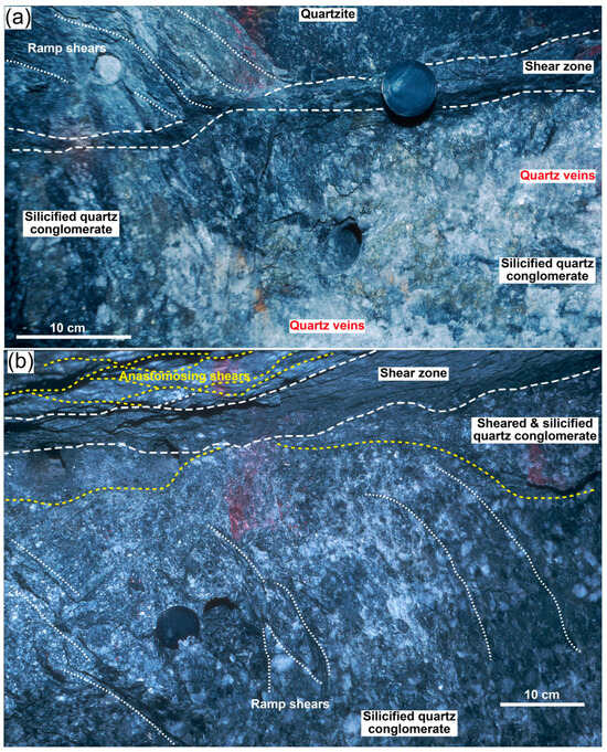 Separate from the sedimentological studies, detailed structural research within the Witwatersrand Supergroup has been focussed on reef packages from all of the goldfields and several different reef groups. These studies have revealed common bedding plane thrusting on the scale of centimetres to many metres, duplication of conglomerate by small ramps, and silty material that has lost silica through alteration and is commonly mapped as shale ‘drapes’ [38,39,40,41]. Thin quartz veining is abundant within metres of the reef packages in all goldfields, and minerals indicative of post-burial alteration (e.g., pyrophyllite, chloritoid) are widespread in all lithologies within and immediately footwall to the reef packages (except the clean quartzite). Although strain has been low and textures well-preserved in parts of the Witwatersrand, high-strain fabrics and thrusts are common [42,43] and occur in the reef packages with slate, phyllite, crenulated schist, and ultracataclastic fault rocks ([5], p. 309), [44,45].