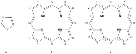 Pyrrole and base porphyrin ring. (a) Pyrrole (C4H4NH) is a five-member nitrogen-containing ring that forms tetrapyrrole molecules. (b) Unsubstituted porphin tetrapyrrole ring with beta (β) and meso (m) positions labeled along the periphery of the ring. (c) Numeric labels of the 20 carbon molecules forming the porphyrin rings.