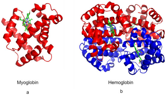 Myoglobin and hemoglobin. (a) Structure of myoglobin (Protein Data Bank ID: 3RGK) monomer (red) [104] and the heme cofactor (green). (b) The structure of the hemoglobin (Protein Data Bank ID: 1A3N) tetramer is composed of α subunits (red) and β subunits (blue) and the heme cofactor (green) [104].