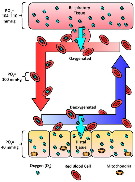 Oxygen transport. The transport of oxygen to distal tissues of the body is mediated by the difference in the partial pressure of oxygen (PO2). In human lungs, the PO2 ranges from 104–110 mm Hg. Oxygen diffuses down the PO2 gradient from the respiratory tissue into the red blood cells (RBC) (100 mm Hg). The RBCs travel throughout the body to deliver oxygen to the mitochondria of distal tissue (40 mm Hg). Allosteric effectors support the offloading of oxygen.