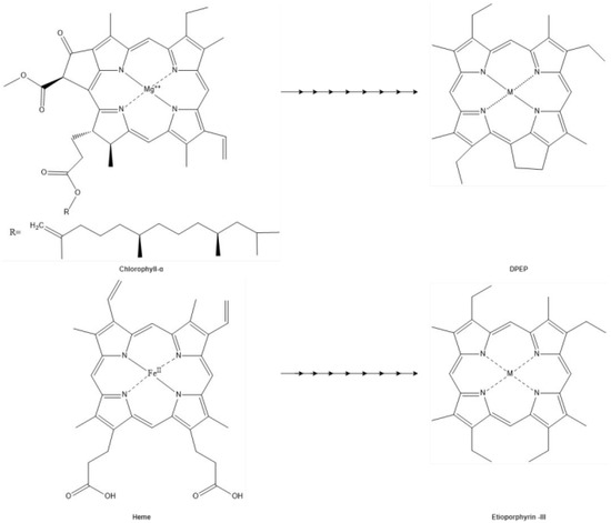 The heme porphyrin has been identified in organic sediment and fossil tissue samples as old as 1.1 Ga [33,187]. Tetrapyrroles (i.e., heme and chlorophylls) buried in sediment are altered by diagenetic processes into products referred to as geophorphyrins [7,8,9,13]. Depending on the depositional environment, these porphyrins may undergo processes such as hydrolysis, reduction, oxidation, demetallation, and remetallation [33,43]. The Treibs scheme [188] suggests that heme and chlorophylls are the biogenetic sources of the geoporphyrins etioporphyrin III and deoxophyloerythoerthoetioporphyrin (DPEP), respectively (Figure 6). It has been suggested that the diagenetic products of heme may also include the geoporphyrins di-DPEP, Rhodo-DPEP, and Rhodo-etioporphyrin, which have been described from various oils shales (Figure 7) [7,8,9,13,189].
