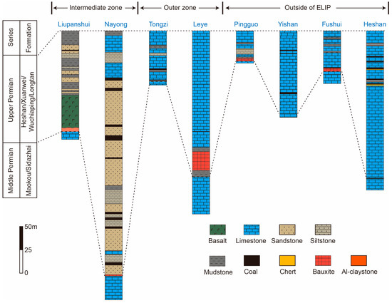 In the Middle Permian, the study area was extensively covered by a restricted carbonate platform in the southwest of the South China Block, which is composed of the Maokou Formation bioclastic limestone and siliceous limestone [34]. At the end of the Middle Permian, the carbonate platform was exposed by rapid differential crustal uplift during the Dongwu movement, resulting in denudation of the Middle Permian Maokou Formation limestone and formation of paleokarst landforms [17,35,36]. With sea level rise in the Late Permian, the coal-bearing sequence formed in terrestrial, transitional, and marine environments, respectively, from northwest to southeast [35] (Figure 2). In the intermediate zone of the ELIP, the Longtan and Wuchiaping Formations unconformably overlie the Emeishan igneous rocks and the Maokou Formation limestone, respectively [7]. The Longtan Formation, a major Late Permian coal-bearing strata in western Guizhou, is divided into upper and lower segments. The upper segment is mainly composed of fine sandstone and siltstone, including 6–19 coal seams. The lower segment mainly consists of siltstone and mudstone, with occasional coal seams, which are relatively rare and have poor stability [4]. In the outer zone of the ELIP, the Heshan Formation unconformably overlies the limestone of the Maokou Formation [11]. The Heshan Formation is divided into upper and lower sections. The lower section of the Heshan Formation is mainly composed of claystone, limestone with siliceous nodules, bioclastic limestone, and a coal seam. The upper section mainly consists of limestone with siliceous nodules interbedded with mudstones, coal seams, and sandstones [14].