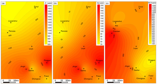 The ionic radii of Y3+ and Ho3+ are similar and have similar geochemical characteristics [53]. Rare earth elements and yttrium are classified into light (LREY: La, Ce, Pr, Nd, and Sm), medium (MREY: Eu, Gd, Tb, Dy, and Y), and heavy (HREY: Ho, Er, Tm, Yb, and Lu) groups based on geochemical classification [54]. In order to assess the distribution characters of Nb, Zr, and REY in bauxite and Al-claystone, the weighted averages of Nb, Zr, and REY in sampling points in the mining are used to replace the contents of the whole mining area. Based on the Kriging interpolation method, Surfer software was used to draw the distribution maps of Nb, Zr, and REY in bauxite and Al-claystone. However, it should be noted that the model is based on only nine points of observation; hence, the trends should only be considered as indicative. The average contents of Zr, Nb, and REY in bauxite and Al-claystone used in Figure 3 are listed in Supplementary Table S3.