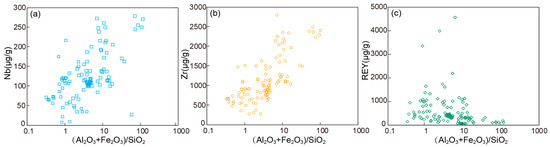 In the study area, numerous reports have indicated the presence of Nb-Zr-REY polymetallic mineralization in the bauxite and Al-claystone at the bottom of the Upper Permian [6,9]. Zr contents in bauxite and Al-claystone range from 278.30 to 2790.92 μg/g, with lower contents in the northwest and higher contents in the southeast (Figure 3a). Bauxites in the Pingguo region have the highest Zr content, peaking at 1981.29 μg/g on average [11,17,20]. The contents of Nb in bauxite and Al-claystone range from 7.40 to 279.00 μg/g, and the distribution character of Nb is similar to that of Zr (Figure 3b). Nb (Ta) is abnormally enriched in bauxite and Al-claystone in the Chongzuo, Fusui, Sanhe, Jingxi, Leye, Pingguo, and Zunyi areas, with (Nb,Ta)2O5 average contents of 0.020 wt.%, 0.015 wt.%, 0.017 wt.%, 0.028 wt.%, 0.023 wt.%, 0.029 wt.%, and 0.015wt.%, respectively, which is higher than the industrial utilization standard of Specifications for Nb (Ta) Mineral Exploration ((Nb,Ta)2O5 > 0.008 wt.%, DZ/T 0203-2020) [55]. REY contents in bauxite and Al-claystone range from 22.18 to 4491.46 μg/g, and the distribution character is different to that of Zr and Nb, with higher contents in the northwest and lower contents in the southeast (Figure 3c). LREY is abnormally enriched in bauxite and Al-claystone in Fusui, Tianyang, Jingxi, Leye, and Zunyi, with the average LERY oxide (LERO) contents of 0.057 wt.%, 0.200 wt.%, 0.066 wt.%, 0.053 wt.%, and 0.052 wt.%, respectively, which is higher than the industrial utilization standard of Specifications for Rare Earth Mineral Exploration (LREO > 0.05 wt.%, DZ/T 0204-2002) [56]. The weathering intensity of parent rocks could be an important reason for the different distribution characteristics of Zr, Nb, and REY in bauxite and Al-claystone [57,58]. With the intensification of weathering, where the parent rock gradually transforms into bauxite, mobile elements, such as K, Na, Ca, Mg, and part of Si, are migrated, while immobile elements, such as Al, Ti, and Fe, are accumulated in situ [58,59]. Therefore, the (Al2O3+Fe2O3)/SiO2 ratio could represent, to some degree, the intensity of weathering during bauxite formation. The contents of Nb and Zr in bauxite and Al-claystone are significantly positively correlated with the (Al2O3+Fe2O3)/SiO2 ratios (Figure 4a,b), whereas the contents of REY in bauxite and Al-claystone are negatively correlated with the (Al2O3+Fe2O3)/SiO2 ratios (Figure 4c), indicating that Zr and Nb preferentially accumulate in the weathering crust, with increasing weathering during bauxite formation, whereas REY is more likely to be removed from parent rocks.