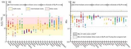 The ratio of Al2O3/TiO2 is widely used to infer the origin of sedimentary rocks, because Al2O3 and TiO2 are relatively immobile during weathering, transport, sedimentation, diagenesis, and epigenesist [64]. Typical ratios of Al2O3/TiO2 range from 3 to 8, 8 to 21, and 21 to 70, corresponding to the parental rocks being of mafic, intermediate, and felsic composition, respectively [17,65]. Since the distribution of REY is hardly influenced by epigenetic and diagenetic processes, this is considered a crucial approach for tracing the provenance of sedimentary rocks [66]. Intermediate-felsic magmatic rocks usually show negative Eu anomalies, whereas basic magmatic rocks show positive or no Eu anomalies [53]. In the studied area, there are significant differences in Al2O3/TiO2 ratios and δEu in the Late Permian coal measures. From the intermediate zone to the outside zone of ELIP, the minimum ratios of Al2O3/TiO2 gradually increase (Figure 5a), while the maximum δEu tends to decrease (Figure 5b). The Al2O3/TiO2 ratios of bauxite and Al-claystone in the bottom of Upper Permian in the intermediate zone of the ELIP range from 2.67 to 14.45 (with an average value of 5.75). The patterns of REE are similar to those of ELIP mafic rocks (Figure 6a), showing significant LREY enrichment and no or a weak negative Eu anomaly (δEu = 0.83–0.96), suggesting that material sources may be weathering products of Emeishan mafic rocks [4,12]. The ratios of Al2O3/TiO2 of coal measures in the middle and upper parts of the Upper Permian in the intermediate zone of ELIP are 3.19–116.00 (with average value of 22.55), and the REE patterns exhibit obvious LREY enrichment, with significant negative Eu anomalies (δEu = 0.17–0.70), similar to the intermediate-felsic rocks in the ELIP and the Truong Son orogenic belt (Figure 6b). The ratios of Al2O3/TiO2 and REE patterns suggest that the detrital material might be derived from intermediate-felsic volcanic rocks [11]. In the outer zone of ELIP, the ratios of Al2O3/TiO2 in coal measures vary widely (Al2O3/TiO2 = 4.53–73.00), and the REY patterns are complex (Figure 6c). The δEu of coal measures in Banai, Zunyi, Sidazhai, and Jinshajiang are 0.79, 0.75, 0.84, and 0.74, respectively, showing no or weak negative Eu anomalies, and the δEu of coal measures in Yudai and Leye are 0.32 and 0.63, respectively, showing significant negative Eu anomalies, suggesting that the detrital material is derived mainly from ELIP mafic rocks, with a minor contribution from intermediate-felsic rocks. The Al2O3/TiO2 ratios of coal measures in the outside zone of ELIP range from 3.13 to 135.93 (with an average value of 27.18), and the REE patterns are similar to the intermediate-felsic rocks in the ELIP and the Truong Son orogenic belt (Figure 6d), with obvious LREY enrichment and significant negative Eu anomalies (δEu = 0.35–0.53), indicating that the detrital material is probably derived from intermediate-felsic volcanic rocks [17].