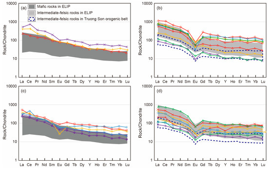 Chondrite-normalized REE pattern distributions: (a) bauxite and Al-claystone in the intermediate zone of ELIP, (b) claystone and coal in the intermediate zone of ELIP, (c) coal measure in the outer zone of ELIP, and (d) coal measure in the outside zone of ELIP. The symbols and lines represent rocks in different areas, corresponding to the horizontal coordinates of Figure 5.