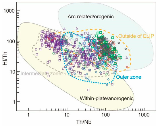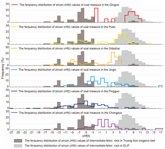In addition, high-precision U-Pb dating and Lu-Hf in situ isotopic analysis of detrital zircon grains are important methods for determining the provenance of sedimentary rocks [7,52]. Zircon U-Pb dating shows that the age of the Late Permian coal measures (263–257 Ma) is consistent with that of ELIP intermediate-felsic volcanic rocks (267–255 Ma) and Truong Son intermediate-felsic island arc rocks (263–256 Ma; Figure 1). The εHf(t) values of zircon (with U-Pb ages of 251–269 Ma) from the Late Permian in Qingyin, Puan, Sidazhai, Jingxi, Pingguo, and Chongzuo are –1.85–11.50, –14.60–14.40, –14.27–5.50, –7.69–11.17, –10.23–17.88, –26.70–12.60, and –6.88–17.87, respectively. The εHf(t) values of zircon in ELIP intermediate-felsic rocks exhibit positive values, whereas the εHf(t) values of zircon in Truong Son medium-acid island arc magmatic rocks show negative values [17]. From the intermediate zone to the outside zone of ELIP, the εHf(t) peak values gradually change from positive values to negative values (Figure 7). According to the Hf/Th-Th/Nb discrimination diagram of detrital zircons (Figure 8), the detrital zircons in the intermediate zone of the ELIP mostly fall into the within-plate/anorogenic region, whereas those in the outside of ELIP mostly fall into the arc-related/orogenic region, with those in the outer zone of ELIP falling into the region between arc-related/orogenic and within-plate/anorogenic. The zircon U-Pb ages and Lu-Hf isotope data indicate that the intermediate-felsic components of the coal measures in the intermediate zone, outer zone, and outside zone of ELIP are derived mainly from intermediate-felsic volcanic rocks from the ELIP, the mixture from ELIP and the Truong Son orogenic belt, and the Truong Son orogenic belts, respectively [4,21].