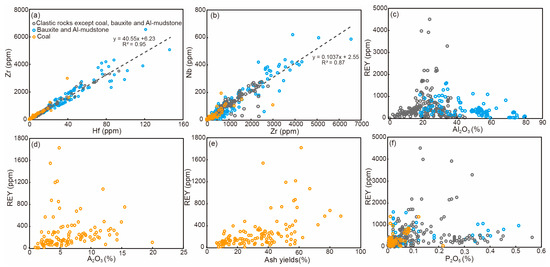 Relationship between Zr and Hf in coal measures (a), Nb and Zr in coal measures (b), REY and Al2O3 in bauxite and Al-mudstone (c), REY and Al2O3 in coal (d), REY and ash yields in coal (e), and REY and P2O5 in coal measures (f).