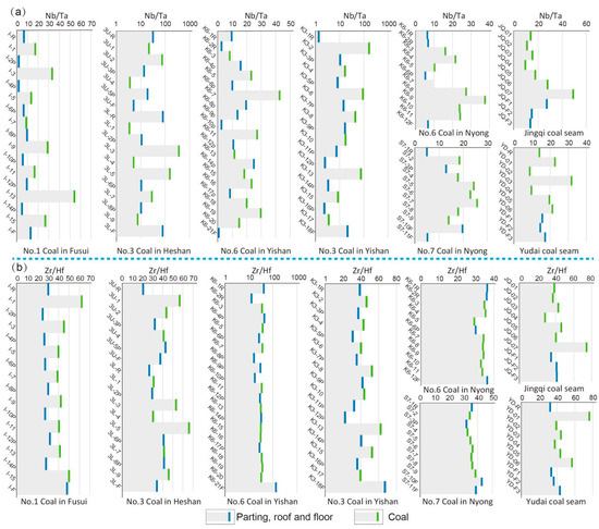 Nb/Ta (a) and Zr/Hf (b) ratios of coal, parting, roof, and floor.