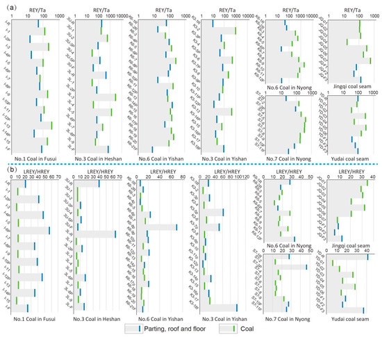 The adsorption experiments show that REE can combine with -COOH and -OH to form a stable compound after replacing the Na+, K+, Ca2+, and Mg2+ ions in coal through cation exchange under acidic conditions [81]. Meanwhile, compared to LREY, HREY are more likely to combine with organic compounds and form more stable organic compounds [71]. The ratios of REY/Ta in the parting and roof were generally lower than those in underlying coal seams (Figure 11a). However, the LREY/HREY ratios in the parting and roof were generally higher than those in the underlying coal seams (Figure 11b), indicating that REY, especially HREY, tended to combine with organic matter in acidic solution during coalification.