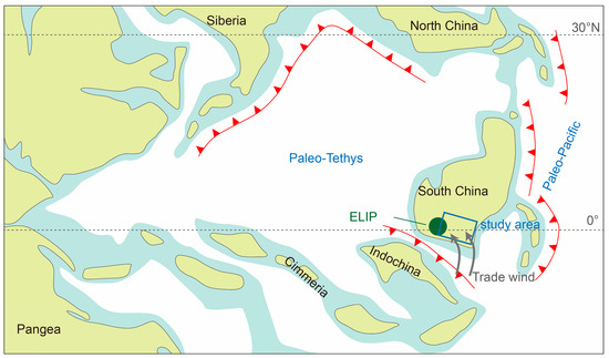 According to paleomagnetic and paleoclimatic reconstruction, the South China Block straddles the equator, and the study area was probably located near the equator [82]. In addition, previous studies have shown that the South China Block underwent significant clockwise rotation during the Middle–Late Paleozoic and the ELIP was located to the west of the study area during the Late Permian [83]. The southern margin of the South China Block was a passive continental margin that merged with the Paleo-Tethys oceanic crust, which in turn subducted beneath the Indochina block, formed the Permian Island arc, and finally coalesced into the Truong Son orogenic belt at the end of the Triassic [20,22] (Figure 12).