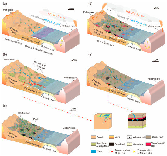(a) The formation of Emeishan basalt and the deposition of intermediate-felsic volcanic ash on Maokou Formation limestone. (b) The transportation of Si and REY during the formation of bauxite and Al-claystone. (c) The accumulation of peat and the formation of coal and clastic rock. (d) The intermediate-felsic volcanic ash of ELIP and the Truong Son orogenic belt fell into peatlands. (e) The leaching of Nb, Zr, and REY in acidic solution.