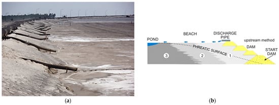 Figure 2. Żelazny Most TSF: (a) wet deposition of tailings, photo: KGHM Polska Miedź; (b) diagrammatic section: 1—coarse tailings (fine sands), 2—transitional zone (silt and sand), 3—fine tailings and slimes (clay and silt) [1].