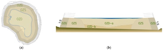 Figure 3. (a) Generalized grain size distribution of tailings deposited in the TSF; (b) an example cross-section through the storage facility, where OZG—coarse tailings used for dam construction, OZS—coarse tailings with some amount of fines, OZD—fine tailings deposited in the pond: OZD–a—fine tailings in liquid state, and OZD–b—consolidated fine tailings.