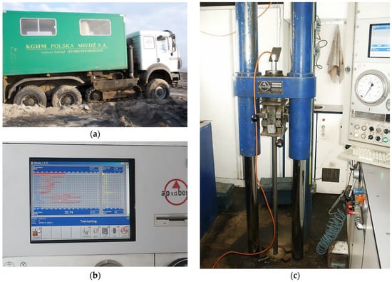 Figure 5. (a) Hyson 200 kN track-truck type by a.p. van den Berg company (Heerenveen, Netherlands); (b) touch screen by a.p. van den Berg company (Heerenveen, Netherlands); (c) interior of the Hyson, photo: KGHM Polska Miedź (Lubin, Poland).