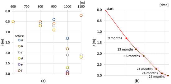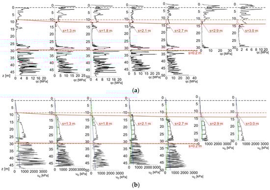 Figure 8. (a) The settlements assessed by the graphical direct method at point 1+000 over a period of more than 2 years: qc curves; (b) dissipation curves uc. The dashed line corresponds to a value of s = 0.0 m, and the distance between the dashed line and the solid line represents the value of s [m].