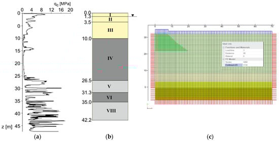 Figure 10. Point 1+000: (a) cone resistance distribution qc; (b) calculation scheme based on qc; (c) generated mesh of elements.