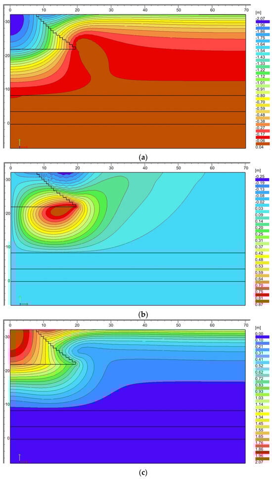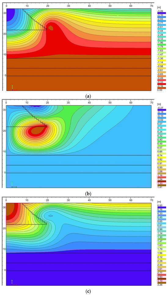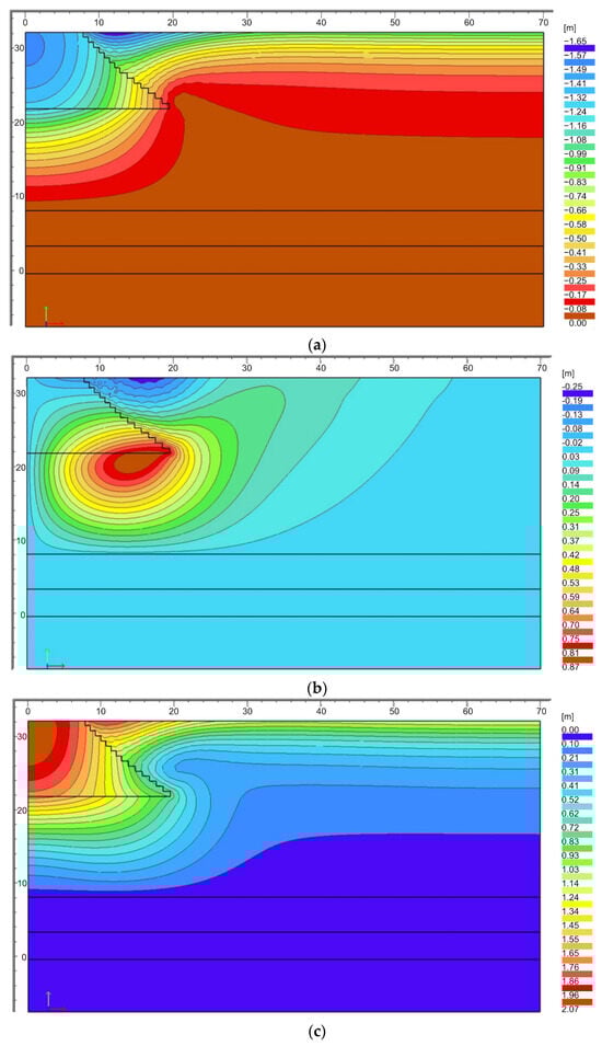 Stage I—loading progressively increased over 3 weeks to 50 kPa after the completion of Stage I settlement shapes at a level of 165 cm (Figure 11a). Additionally, the largest horizontal displacements, reaching up to 60 cm, are generated in the less-deformable zone of the tailings subsoil (Figure 11b). The greatest total deformations occur in the axis of the embankment and in the slope (Figure 11c).