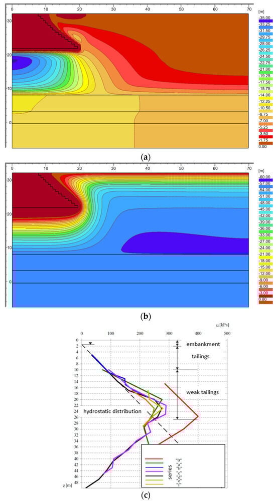 To validate the results, the distribution of pore water pressure excess in tailings during the initial phase of Stage I (Figure 14a,b) was compared with the actual distribution, determined based on CPTU with pore pressure measurements (Figure 14c). An analysis of Figure 14a indicates that the highest excess of pore water pressure occurs in the highly compressible silty layer, initially reaching 35 kPa (Figure 14a,b). The distribution of pore water pressure excess, as demonstrated by the results of dissipation tests, exhibits a similar shape with proportionally higher values (Figure 14c).