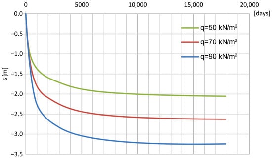 Analysis of the figure indicates that at the end of Stage I, the degree of consolidation will be 55%, and by the end of Stage II, it will increase to 65%. It is estimated that achieving a consolidation degree of 90% in Stage III would require a longer time (approximately 10 years, Figure 15). The figure also illustrates that the maximum settlements, already after the consolidation process, will be approximately 204 cm for 50 kN/m2, 260 cm for 70 kN/m2, and 326 cm for 90 kN/m2 (Figure 15).