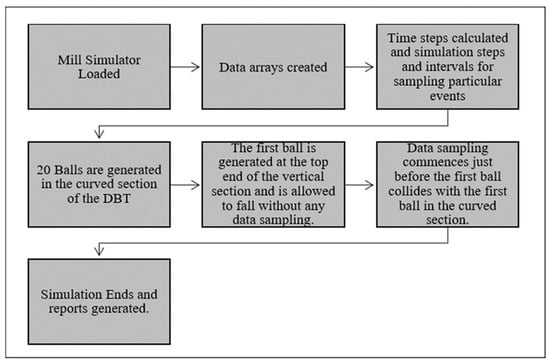 Since the free-fall time was uneventful, the data capturing of the simulation was only triggered before the falling ball collided with the first ball in the curved column. The sampling of data continued until the end ball had been ejected. Figure 2 summarises the simulation process.