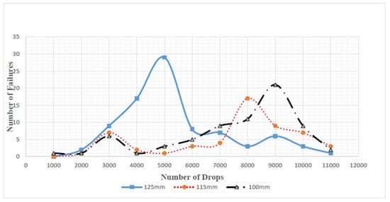 The results of the DBT experiments are discussed in this section. The three main sizes under study were 100 mm, 115 mm, and 125 mm forged steel balls, and the ball failures were described as either total fracture or spalling. Total fracture is a mode of failure in which the ball breaks into two semi-spheres across either its polar or equatorial diameter. Spalling is described as the chipping off of the ball’s outer surface, exposing the inner part of the ball. After spalling, the ball sometimes retains its shape but with a loss in mass. Table 3 shows the DBT data for the three ball sizes, the graphical presentation of which is shown in Figure 3.