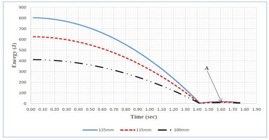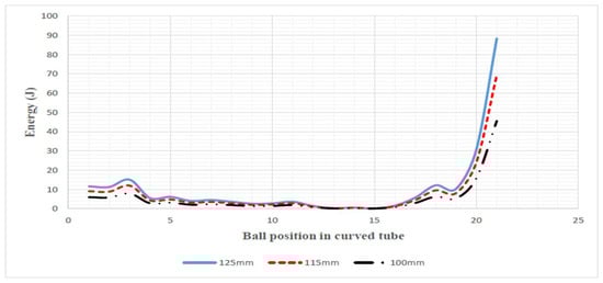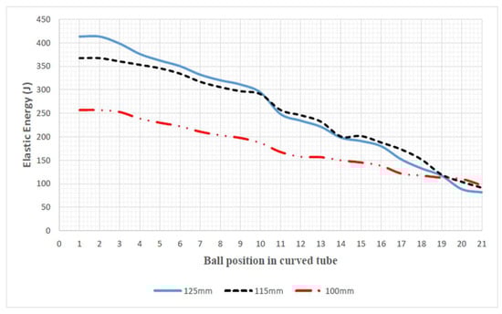 In this section, the details of events that occur from the moment the ball is released at the top of the DBT are captured. From the moment the ball is released, the ball continuously loses its PE as it becomes converted into kinetic energy (KE) until it impacts ball B2 at the top of the curved portion of the tester. In the collision, more than 50% of the energy is transferred to B2, which is instantaneously transferred from ball to ball to the final ball B21. During this transfer, each ball undergoes elastic deformation and recovery but with energy being dissipated in each transfer process. The following figures trace the key energy conversion events that are taking place during the DBT, starting with the history of the first ball from a 10 m height. The set of results for each DBT simulation conducted for the 125 mm, 115 mm, and 100 mm balls were potential, kinetic, and elastic energy, energy loss, and impact energy spectra. Figure 8 shows the PE behaviour of the various ball sizes as they were dropped off from the top end of the vertical section during their respective DBT simulations. Each ball initially possessed its maximum PE prior to drop-off. As the ball falls, the PE gradually drops until the point of impact. After impact, the PE starts to rise again, indicating a rebound after impact.