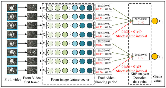 The camera took a froth video every 1–2 min, lasting about 3 min each. Due to the high cost of the XRF analyzer, monitoring of zinc ore grade values could only be carried out using a sampling multiplexing method. The sampling time interval of the XRF analyzer was not completely fixed, with an approximate sampling interval of 17–18 min, which is much longer than the sampling interval for froth videos. As shown in Figure 2, the timestamp of the froth video feature vector did not match the timestamp of the marked zinc ore grade value, requiring timestamp matching.