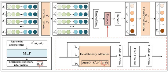 - To prevent the predictive model from overfitting, a de-stationary attention mechanism is constructed to account for the non-stationary information within the original data, replacing the attention mechanism in the vanilla transformer.