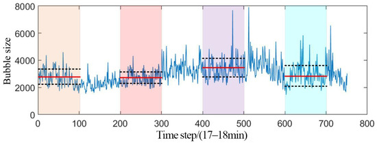 To demonstrate the non-stationarity of the flotation data, we chose to display the time series data of the bubble size in the first frame of the froth video detected by the XRF analyzer, with a total of 800 data points and a time interval of 17–18 min between each data point, as shown in Figure 4. The red solid line and black dashed line in the figure represent the average bubble size and variance during the time period, respectively. From Figure 4, it can be observed that the data curve does not have a clear trend, and the mean and variance show different variations. Consequently, this study proposed modifying the attention mechanism of the vanilla transformer model into a de-stationary attention mechanism, aiming to approximate the attention learning in the original non-stationary sequences.
