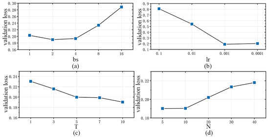 To identify the optimal hyperparameters, a grid search strategy [28] was employed on the validation set for selection. The grid search strategy is an efficient optimization algorithm that divides the search space into a grid. It quickly eliminates impossible solutions, narrows down the search range, and improves efficiency. Meanwhile, tt also has a good parallel processing capability, making it faster and effectively utilizing computer resources. The batch size was chosen in group ; the learning rate was selected in group ; the sampling time step was decided in group ; and the number of hidden units was determined in group . Optimal prediction performance is achieved when the loss is minimized, with the loss on the validation set serving as the criterion. The prediction model was trained on the training dataset and validated on the validation dataset. The validation process was randomly executed 50 times, and the average of the validation losses is presented in the Figure 5. When , , and , the validation loss was minimal.