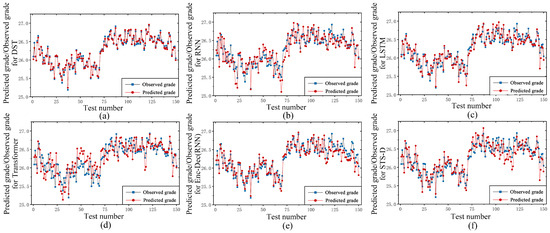 To further demonstrate the effectiveness of the proposed model, the predicted values of all models were compared with the true values on the test data. As illustrated in Figure 6, the blue line represents the observed grade values measured by the XRF analyzer, while the red line denotes the predicted values from the model. As can be seen more intuitively from Figure 6, the fitting effect of the method proposed in this paper was superior to the other comparison methods. Specifically, compared with the RNN model, LSTM model, and Enc-Dec (RNN) model, the method proposed by us had a higher accuracy and stability of fitting effect; compared with the STS-D model, our method had better dynamic adaptability in predicting non-stationary time series; and in comparison with the transformer model, the method proposed by us exhibited stronger robustness in dealing with non-stationary data.