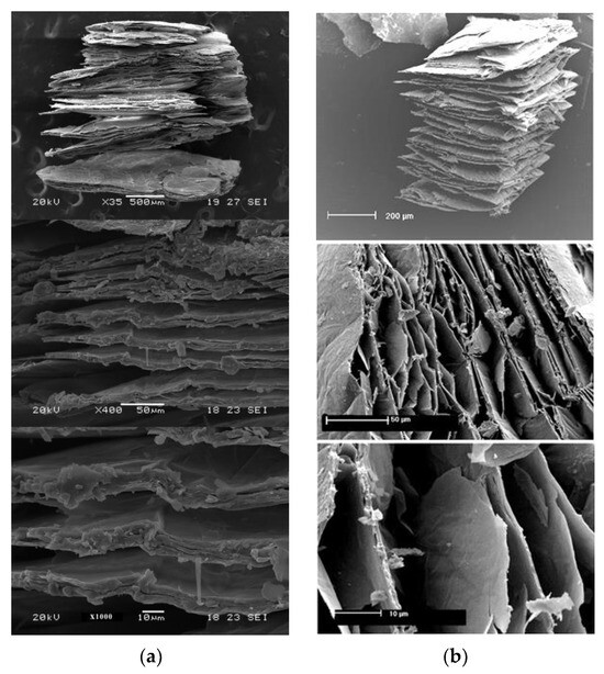 Appearance with SEM observations of the expansion in the vermiculites CHGO: (a) with in situ heating at 1000 °C in H2 atmosphere; (b) with ex situ heating at 1000 °C in ambient atmosphere.