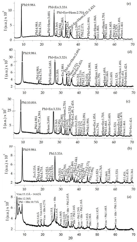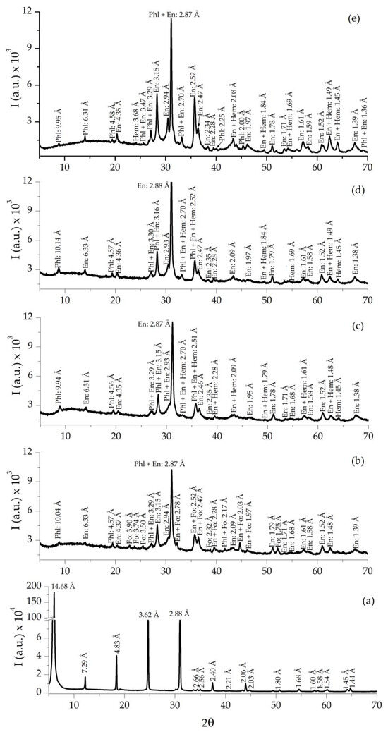 The presence of phases, such as enstatite and forsterite, is due to the chemical composition of the vermiculite, which satisfies the compositional parameters of the SiO2–Al2O3–MgO phase diagram [38].