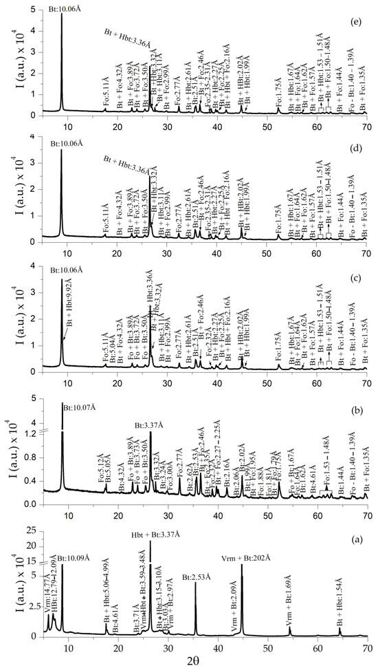 The mineral composition of the raw sample CHS consists of vermiculite (JCPDS-ICCD card 16-613), hydrobiotite (JCPDS card 13-466) and mica biotite (JCPDS card 46-1409) (Figure 9a); after heating at 1000 °C in both air and reduced atmosphere (Figure 9b–e), the vermiculite disappeared and forsterite (JCPDS card 21-1257) appeared (Figure 9b), the reflections intensity decreased in relation to the raw sample.