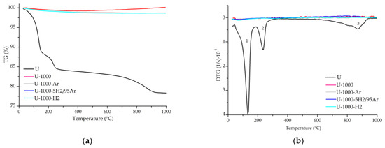 TG (a) and DTG (b) curves for the samples U, U-1000, U-1000-Ar, U-1000-5H2/95Ar, and U-1000-H2. Note: 1—adsorbed surface water loss; 2—interlayer water loss and interlayer cation-bound water; 3—recrystallization.