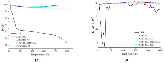 TG (a) and DTG (b) curves for the samples CHS, CHS-1000, CHS-1000-5H2/95Ar, CHS-1000-Ar, and CHS-1000-H2. Note: 1—adsorbed surface water loss; 2—interlayer water loss and interlayer cation-bound water; 3—loss of hydroxyls; 4—decomposition of CO2; 5—recrystallization.
