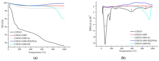 TG (a) and DTG (b) curves for the samples CHGO, CHGO-1000, CHGO-1000-5H2/95Ar, CHGO-1000-Ar, and CHGO-1000-H2. Note: 1—adsorbed surface water loss; 2—interlayer water loss and interlayer cation-bound water; 3—loss of hydroxyls; 4—decomposition of CO2; 5—recrystallization.